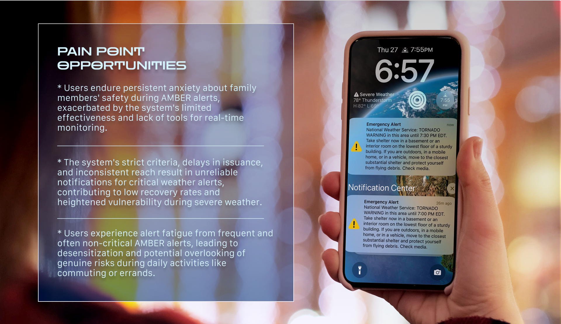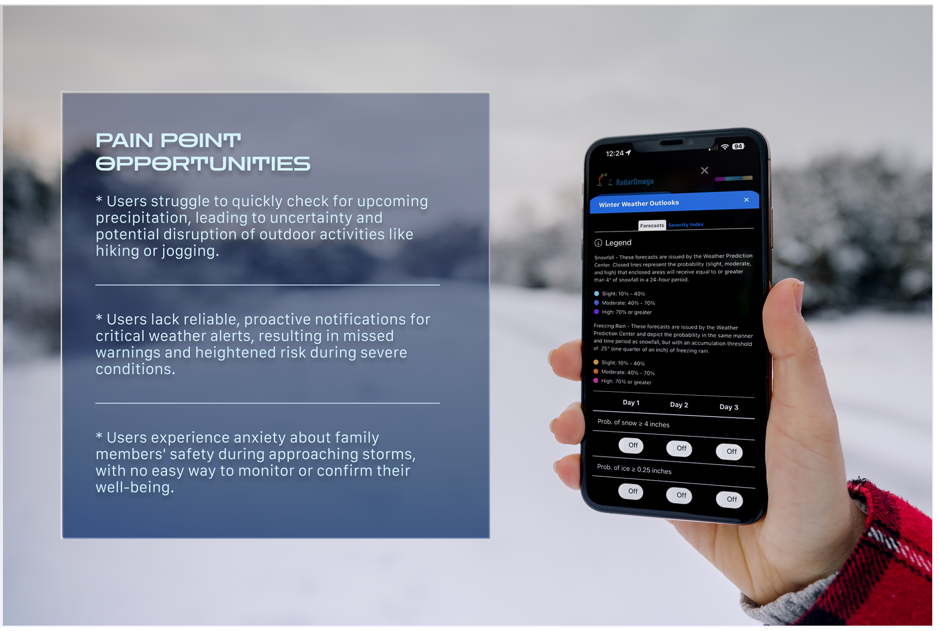 Users need a faster, more intuitive way to understand upcoming weather changes and make confident, real-time decisions. They want clear visual indicators that show precipitation timing and direction without requiring expert interpretation. Reliable, proactive alerts are essential—notifications that not only warn of severe weather but also help users prepare before conditions worsen. Users also seek reassurance through location-based tracking and family safety features, allowing them to monitor loved ones during storms. Above all, they need a weather experience that translates complex NOAA data into simple, actionable insights—reducing uncertainty, preventing disruption to daily routines, and promoting peace of mind.