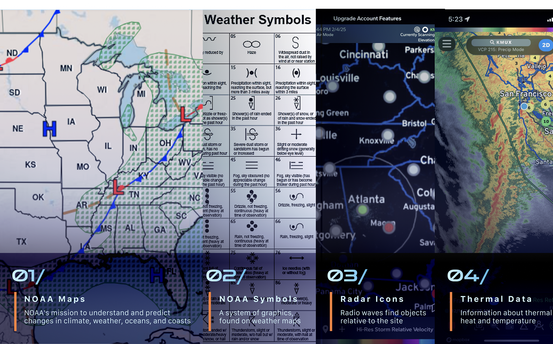 Users of weather apps like RadarOmega often face challenges when viewing NOAA-powered weather maps because the NOAA API provides raw meteorological data filled with specialized symbols, radar icons, and thermal overlays that are not designed for general audiences. This creates cognitive overload when multiple layers overlap, leading to cluttered visuals that make it difficult to identify urgent information such as severe storms. Since most users are unfamiliar with NOAA’s symbol system, they struggle to interpret what the graphics mean without contextual guidance, and the data itself is presented without translation into real-world impact (for example, a cold front symbol versus “expect falling temperatures and possible storms”).