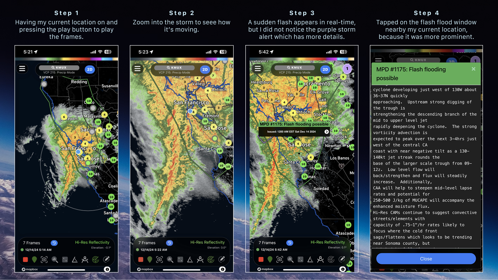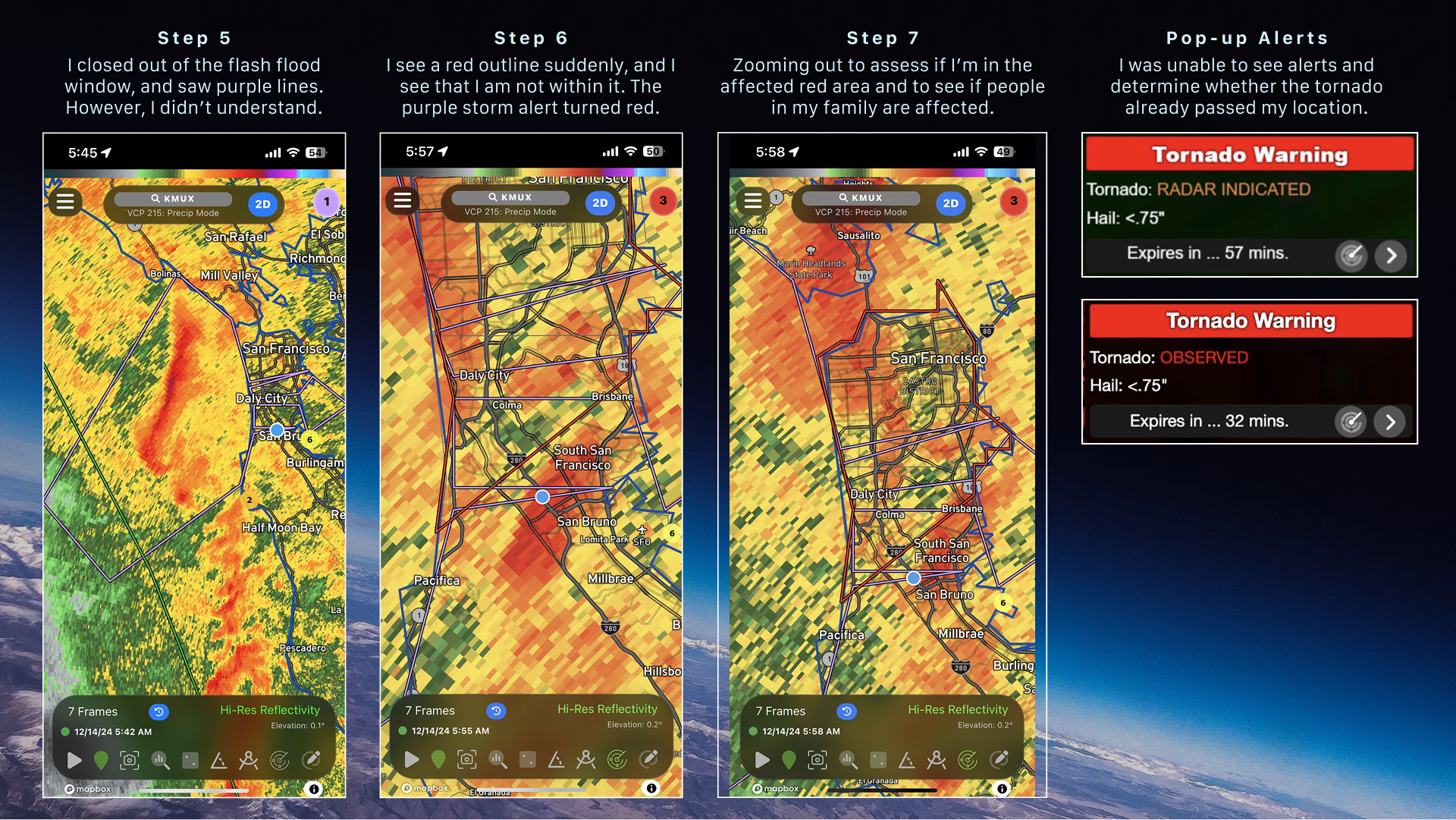 During early 2025, when the first tornado in San Francisco struck—an unprecedented event underscoring the growing impact of climate change—I used the experience as a live usability study to evaluate RadarOmega through the lens of a first-time user. With little prior familiarity, I documented each interaction step by step, observing how intuitive (or not) the process felt under real-world pressure. My focus was on understanding how effectively a new user could navigate the interface, interpret storm visuals, and make time-sensitive decisions during an unfolding severe weather event.