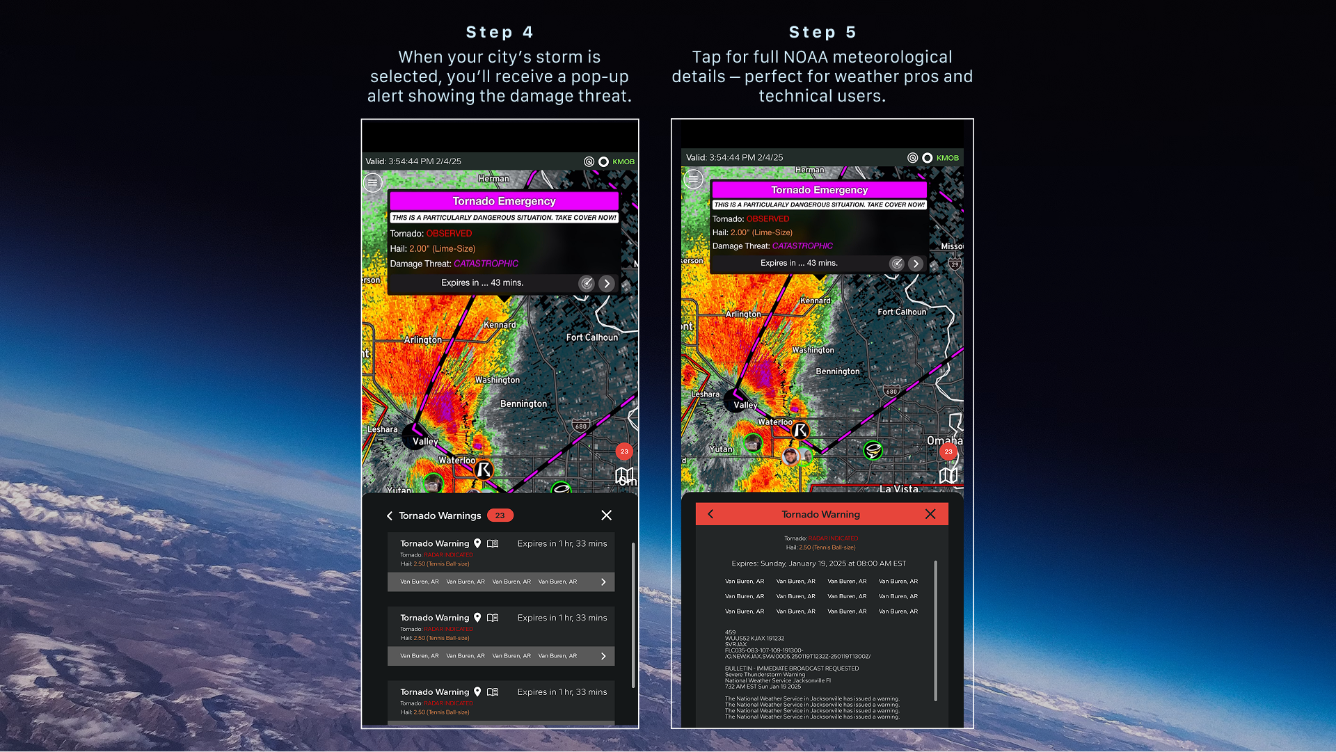 After zooming into the storm (Step 4), a Tornado Emergency banner (purple) appears on the map with critical details—hail size, damage threat, and a live expires in timer—yet it’s easy to miss while the Tornado Warning bottom sheet and the “23” alert list draw focus (Step 5). I redesigned this flow so that when a Tornado Emergency is detected the app (1) auto-pauses animation, (2) snaps to the affected polygon, (3) elevates a sticky purple header with plain-language severity and countdown, and (4) opens a proximity-filtered list derived from the red 23 badge, synced to the selected polygon. I’ve also aligned all color coding with NOAA’s latest official standards and threat-level lexicon (purple = Emergency, red = Warning) and linked interactions—tapping a list item highlights the polygon; tapping the banner reveals the same details in the sheet—so users don’t miss the most severe alert while panning or zooming. This keeps the emergency callout impossible to overlook and reduces time-to-understanding during events like the 2/4/25 outbreak.