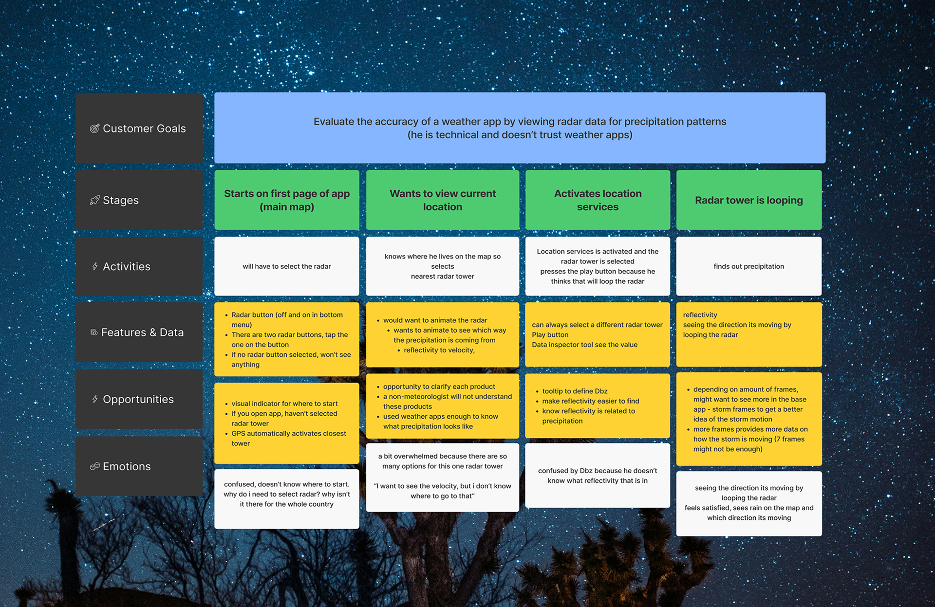 I mapped the journey of a technical user who downloaded a radar app to track rainfall direction for his job. Their simple goal—to view precipitation patterns—was hindered by confusion around selecting radar towers, unclear controls, and technical jargon like reflectivity and Dbz. Although he eventually looped the radar and achieved his goal, it required significant trial and error. This revealed key opportunities to simplify onboarding, auto-surface relevant data, and provide contextual guidance. As lead designer, I reframed the challenge from technical accuracy to user translation, making NOAA’s raw data more accessible and actionable for both experts and everyday users.