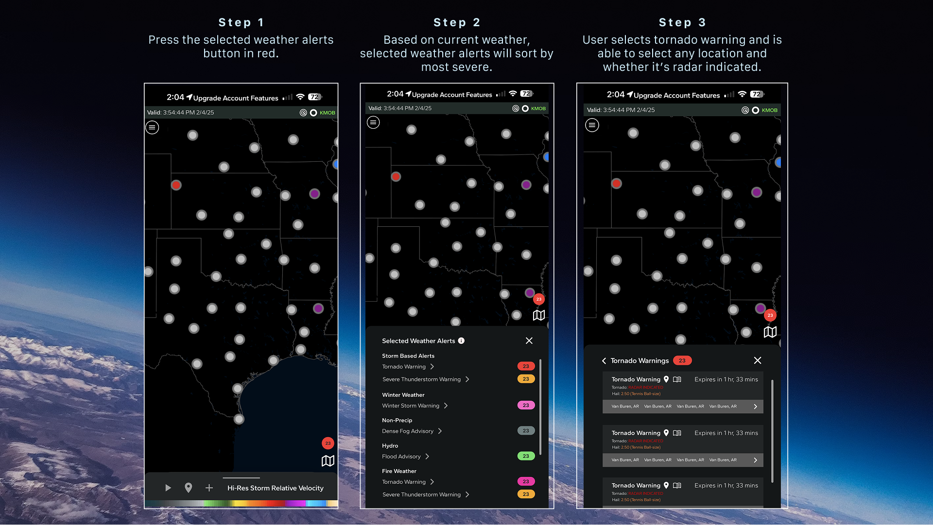 I redesigned the weather alert flow to create a clearer, more intuitive experience for users tracking severe storms. Previously, alerts were difficult to locate and interpret, forcing users to manually search through cluttered menus during high-stress moments. I introduced a simplified, step-based interaction that begins with a single, easily identifiable red button to access weather alerts. Once selected, the alerts automatically sort by severity based on live NOAA data, allowing users to immediately prioritize the most critical warnings. From there, users can drill down into specific locations—such as tornado warnings—and quickly determine whether the event is radar-indicated and how much time remains before expiration. This reduced cognitive friction, minimized navigation time, and transformed a reactive, data-heavy interface into a guided, proactive tool that empowers users to make faster, more informed safety decisions.