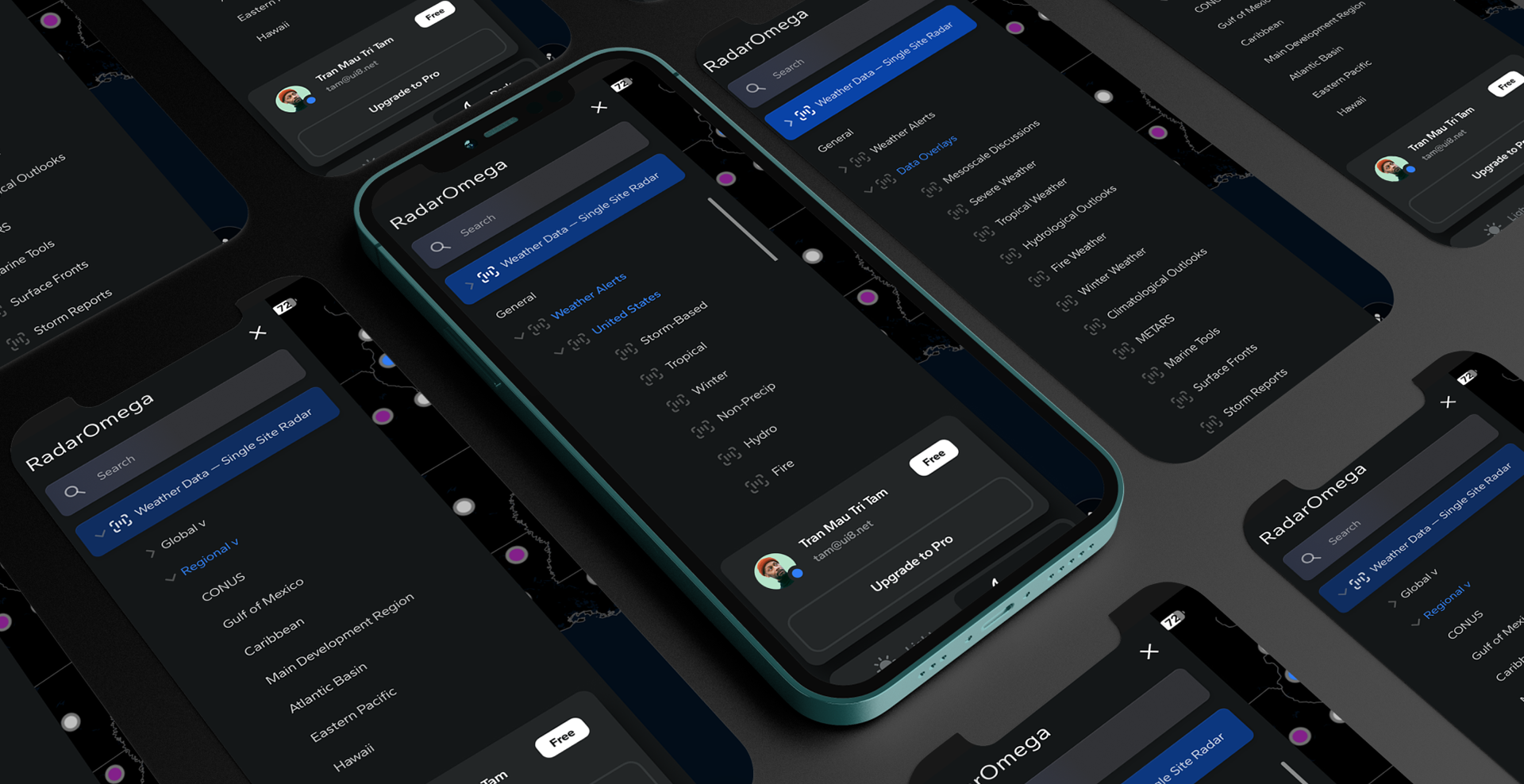 The core information-architecture challenge was fitting RadarOmega’s vast, tiered feature set—dozens of free vs. premium radar/satellite overlays, velocity tools, dual-pol products, Level 3 data, and an expansive alert catalog from basic warnings to tropical, marine, fire-weather, and trail-integrated notifications—into a single, shallow navigation menu without overwhelming casual users or slowing down meteorologists and storm chasers who demand one-tap access to mission-critical layers during live events.